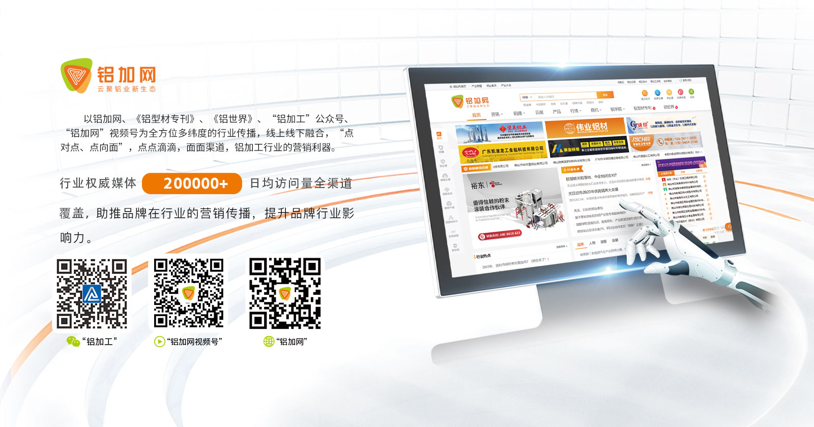 鋁加網(wǎng)(www.albiz.cn)是聞名鋁加工行業(yè)的垂直門戶網(wǎng)站,云聚鋁業(yè)新生態(tài),構(gòu)建鋁業(yè)新場景,以albiz.cn 網(wǎng)站為核心,以移動云端、鋁加工微信、鋁加網(wǎng)視頻號、《鋁型材專刊》和《鋁世界》雜志為載體,成為了鋁加工行業(yè)資訊和精準傳播的首選傳媒。鋁加網(wǎng),采集和發(fā)布全行業(yè)信息資訊,提供線上展覽、在線直播、短視頻、品牌策劃、品牌運營、品牌傳播等全方位的專業(yè)服務。
